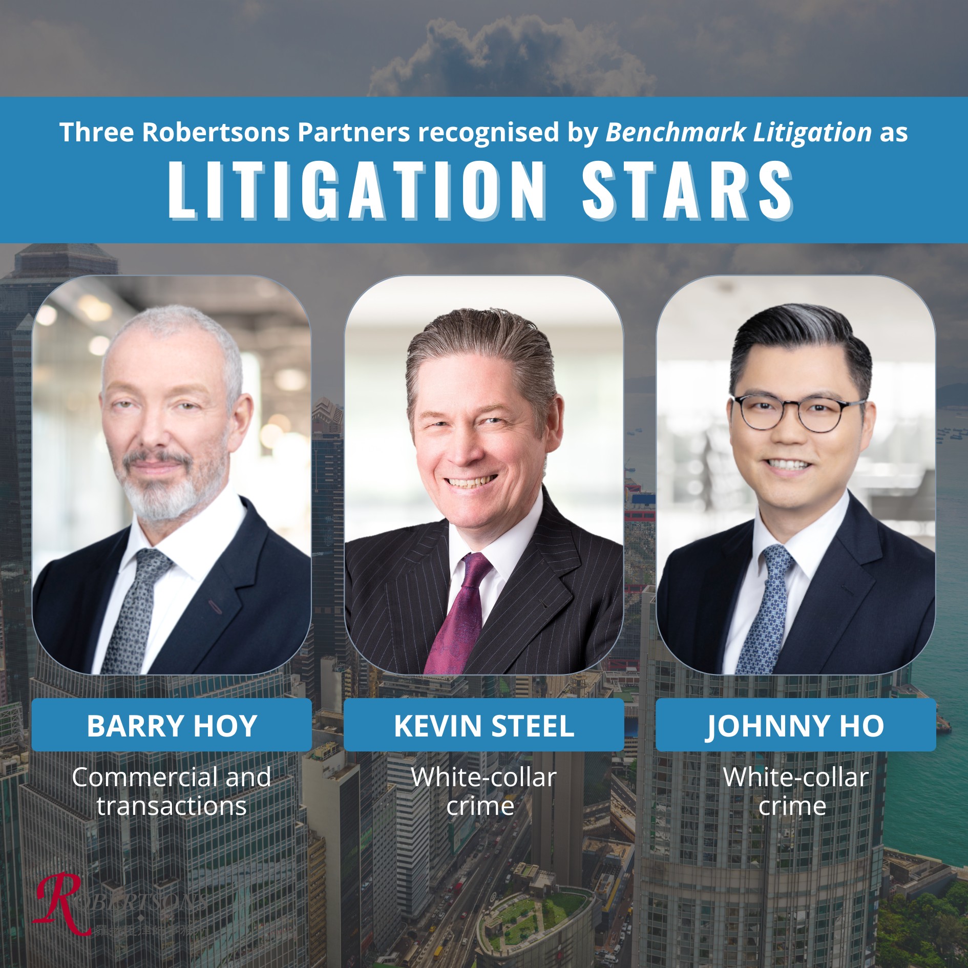 Robertsons is proud to announce that, once again, our Partners, Barry Hoy, Kevin Steel and Johnny Ho, have been recognised as Litigation Stars by the 2025 edition of Benchmark Litigation Asia-Pacific in areas of commercial and transactions, and white-collar crime.