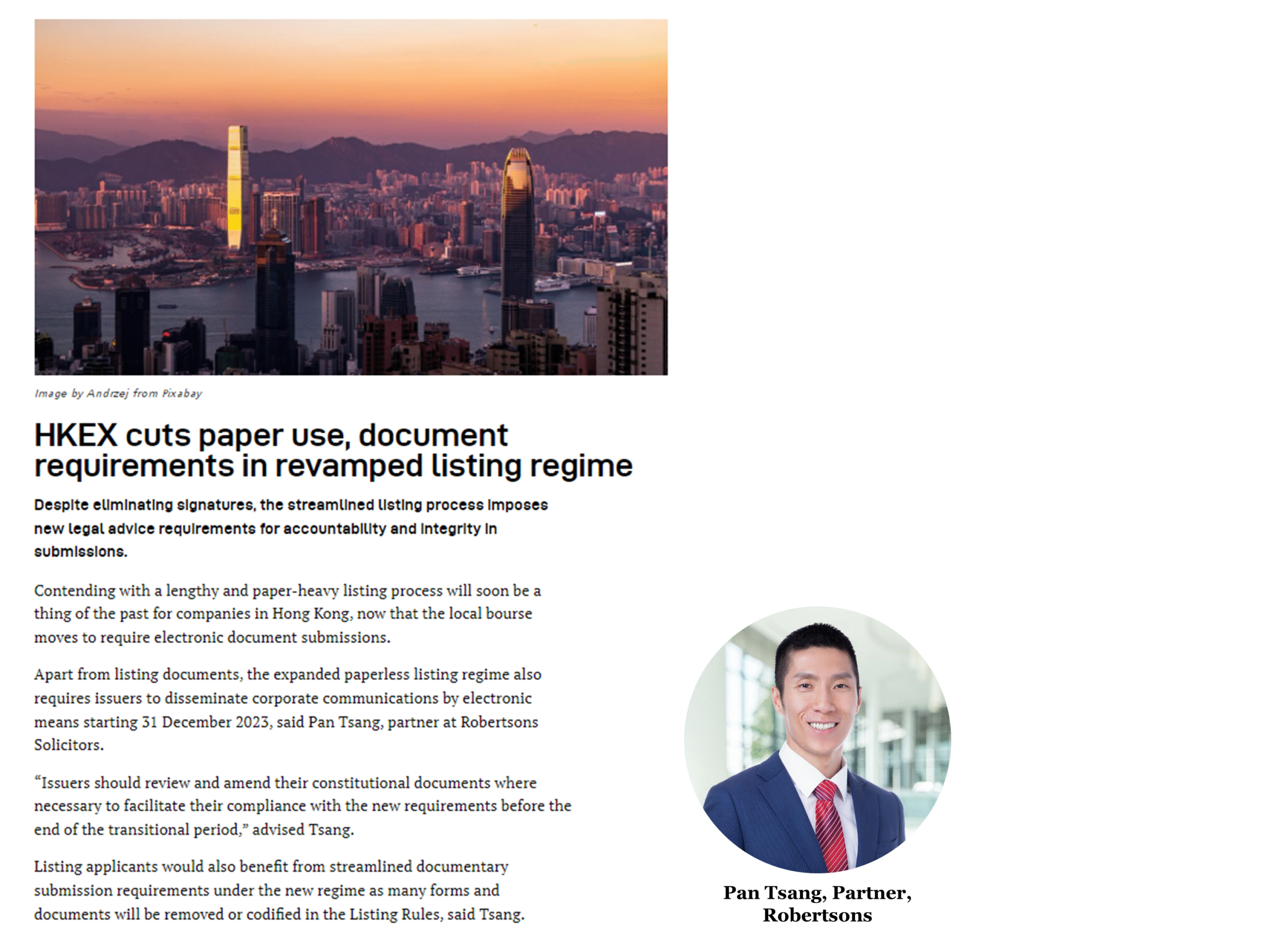 Robertsons’ Partner, Pan Tsang, commented on the major changes to the expanded paperless listing regime of Hong Kong that companies must take note of.