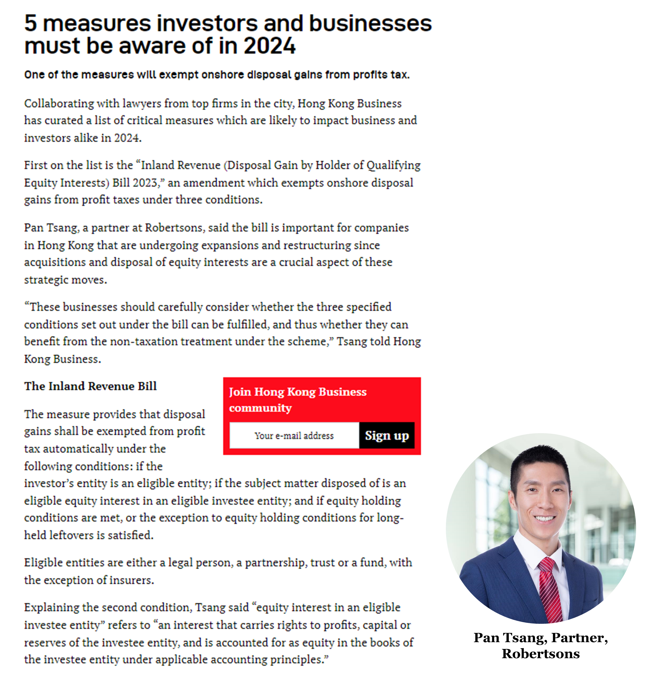 Interviewed by Hong Kong Business regarding measures investors and businesses must be aware of in 2024, Robertsons’ Partner, Pan Tsang, explained about and shared his insights on the bills concerning inland revenue, product eco-responsibility and waste disposal.