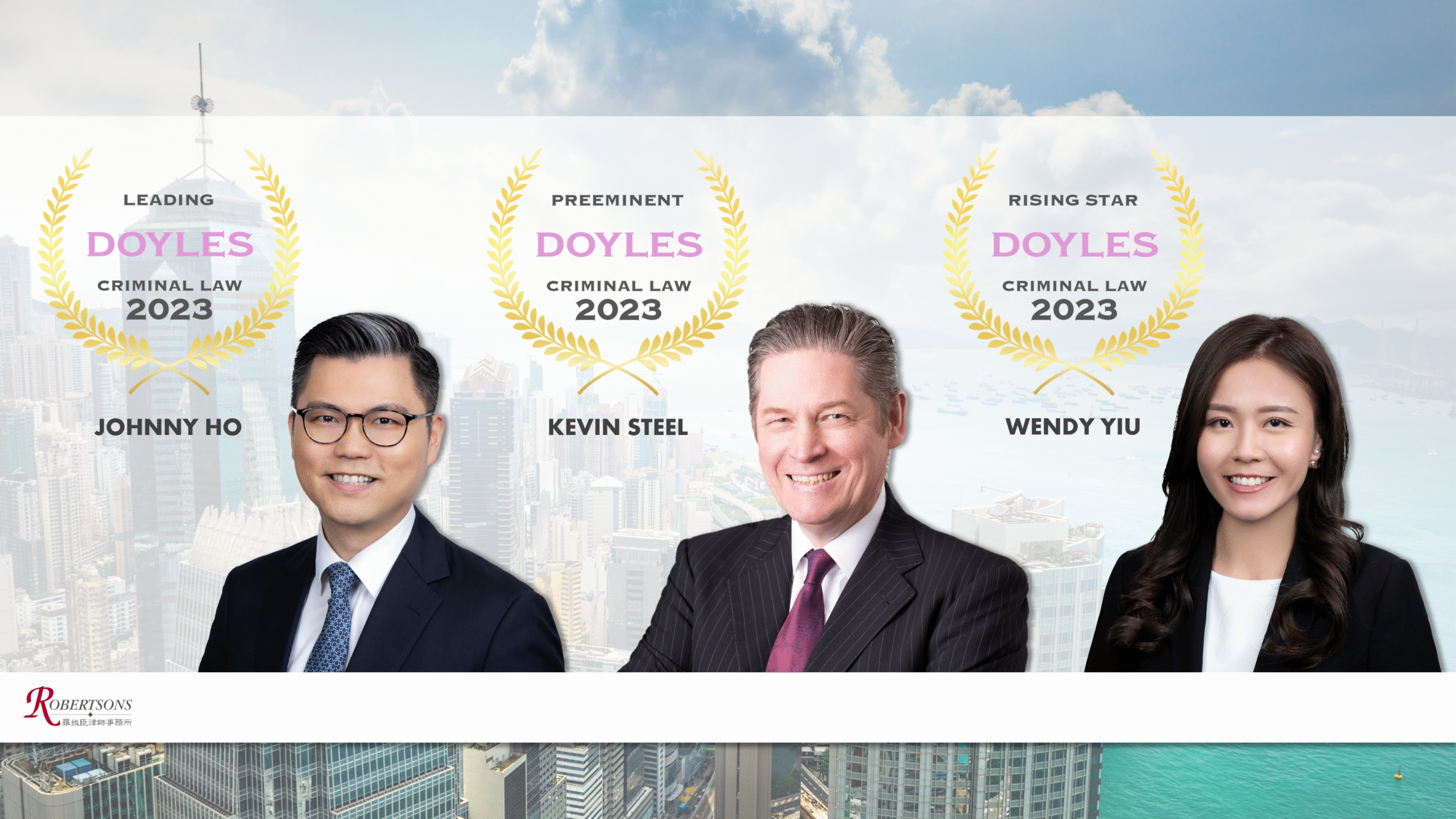 In addition to Robertsons being ranked as one of the leading criminal defence law firms in Hong Kong (details), our partners Kevin Steel and Johnny Ho have been named respectively as a preeminent and a leading lawyer in the 2023 listing of “Leading Hong Kong Criminal Lawyers” (details) and “Leading Hong Kong White Collar Crime, Corporate Crime & Regulatory Investigations Lawyers” (details).