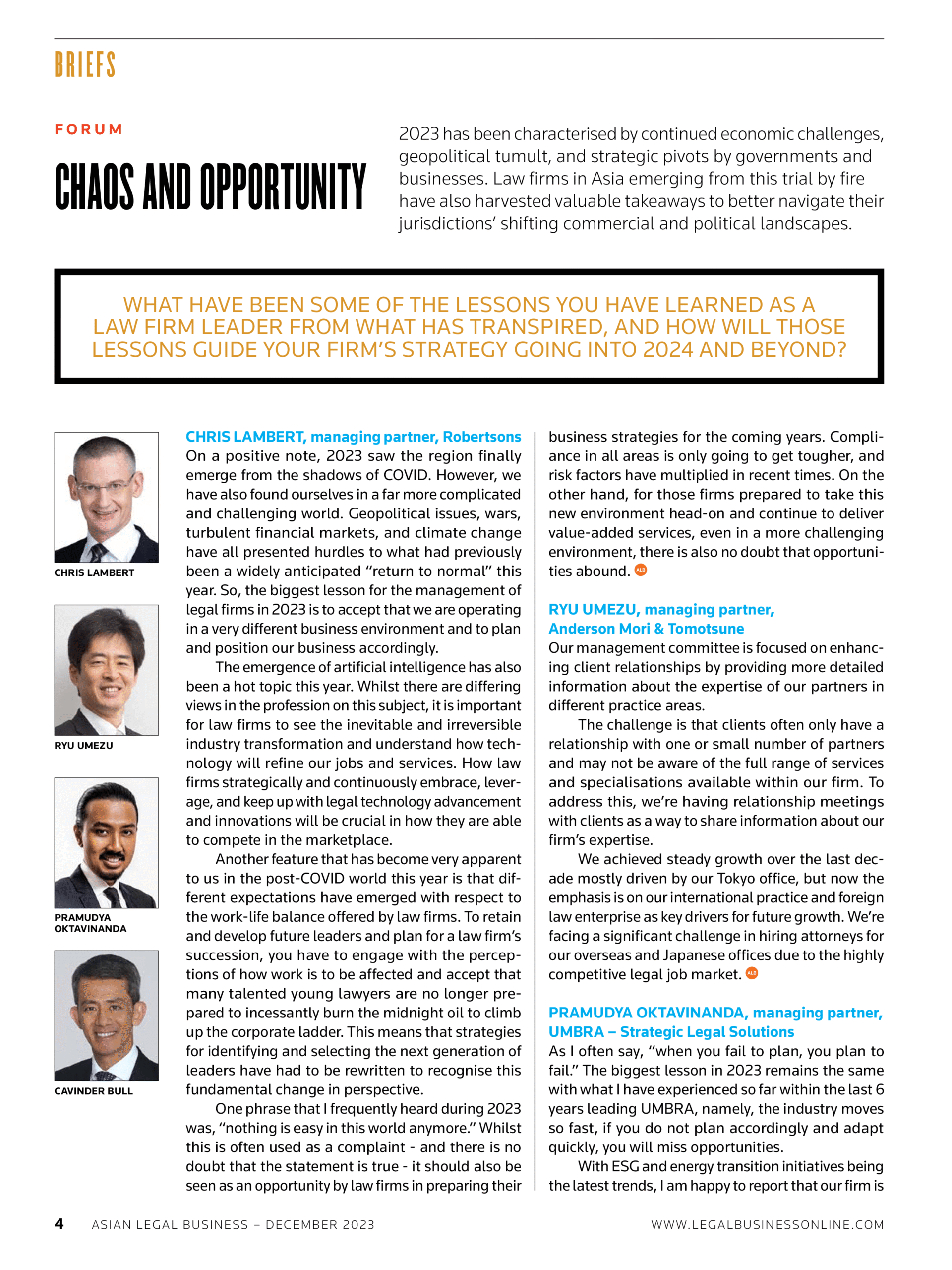 Robertsons’ Managing Partner, Chris Lambert, participated in Asian Legal Business (ALB)’ forum. Chris was quoted in ALB’s December issue, in response to the question of “What have been some of the lessons you have learned as a law firm leader from what has transpired, and how will those lessons guide your firm’s strategy going into 2024 and beyond?”.