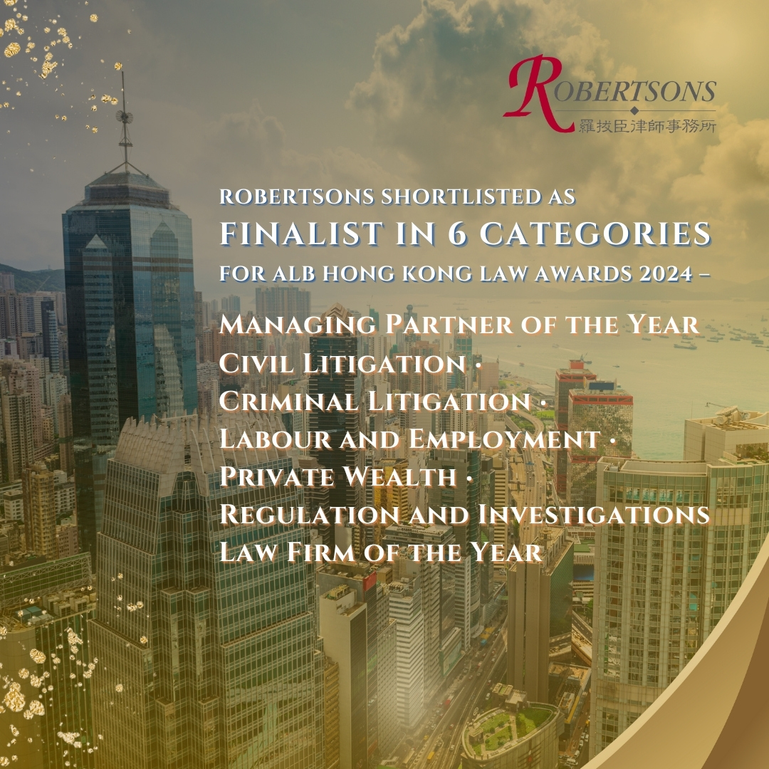 Robertsons is proud to announce that we have been shortlisted as a finalist in six categories for the Asian Legal Business Hong Kong Law Awards 2024. They are: