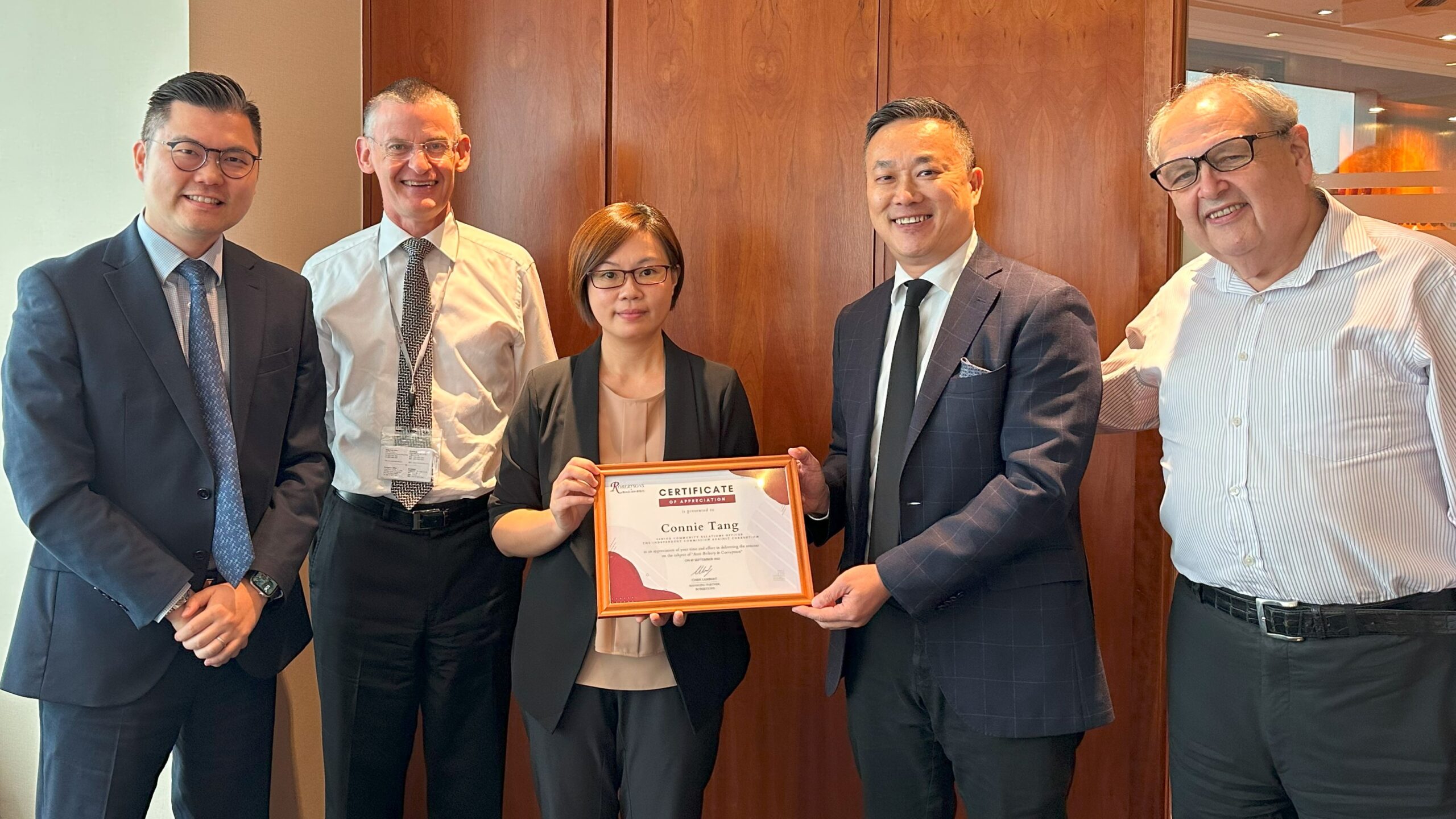 Aligning with the Independent Commission Against Corruption (ICAC)’s promotion of zero tolerance towards corruption within our society, Robertsons was pleased to have Ms. Connie Tang from ICAC to deliver a seminar for us last Thursday (7th September 2023) with insightful information on anti-bribery / anti-corruption laws, common corruption traps at work and guidance on handling ethical issues. The seminar helped to enhance our understanding of the nuanced challenges associated with bribery and corruption. As legal practitioners, we recognise our important role in combating corrupt and unlawful practices and to ensure that we uphold the highest standards of integrity and ethics.