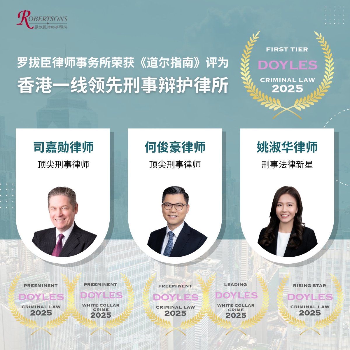 本所的刑事及商业罪案团队再度荣获《道尔指南》的认可,在其今天公布的2025年度榜单中获得以下殊荣: