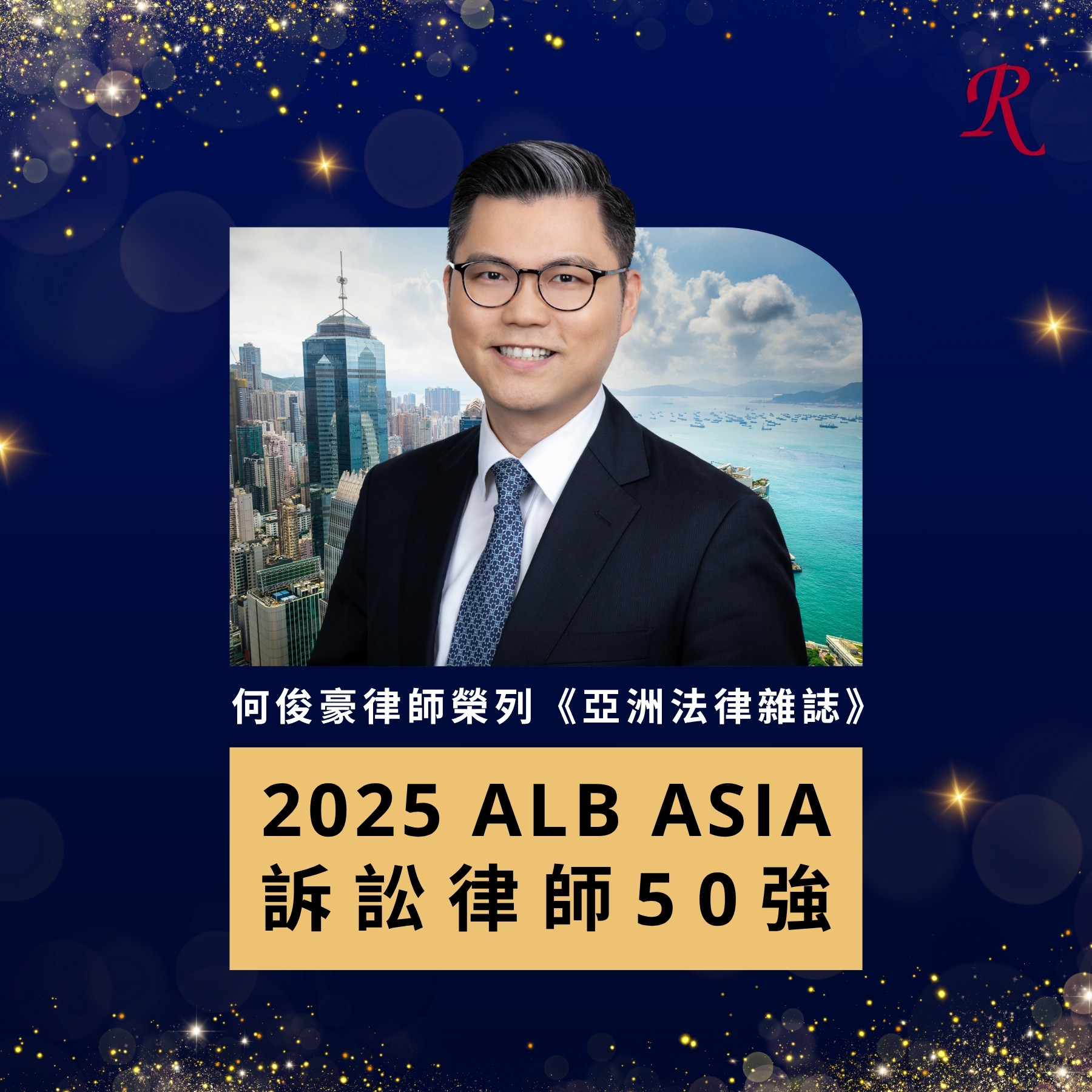 本所榮幸地宣布,合夥人何俊豪律師榮列《亞洲法律雜誌》2025年度「ALB Asia 訴訟律師50強」榜單。該榜單匯集了亞洲地區最卓越的爭議排解法律人才,入選者基於客戶的高度推薦,充分體現了他們卓越的往績和出色的訟辯能力。