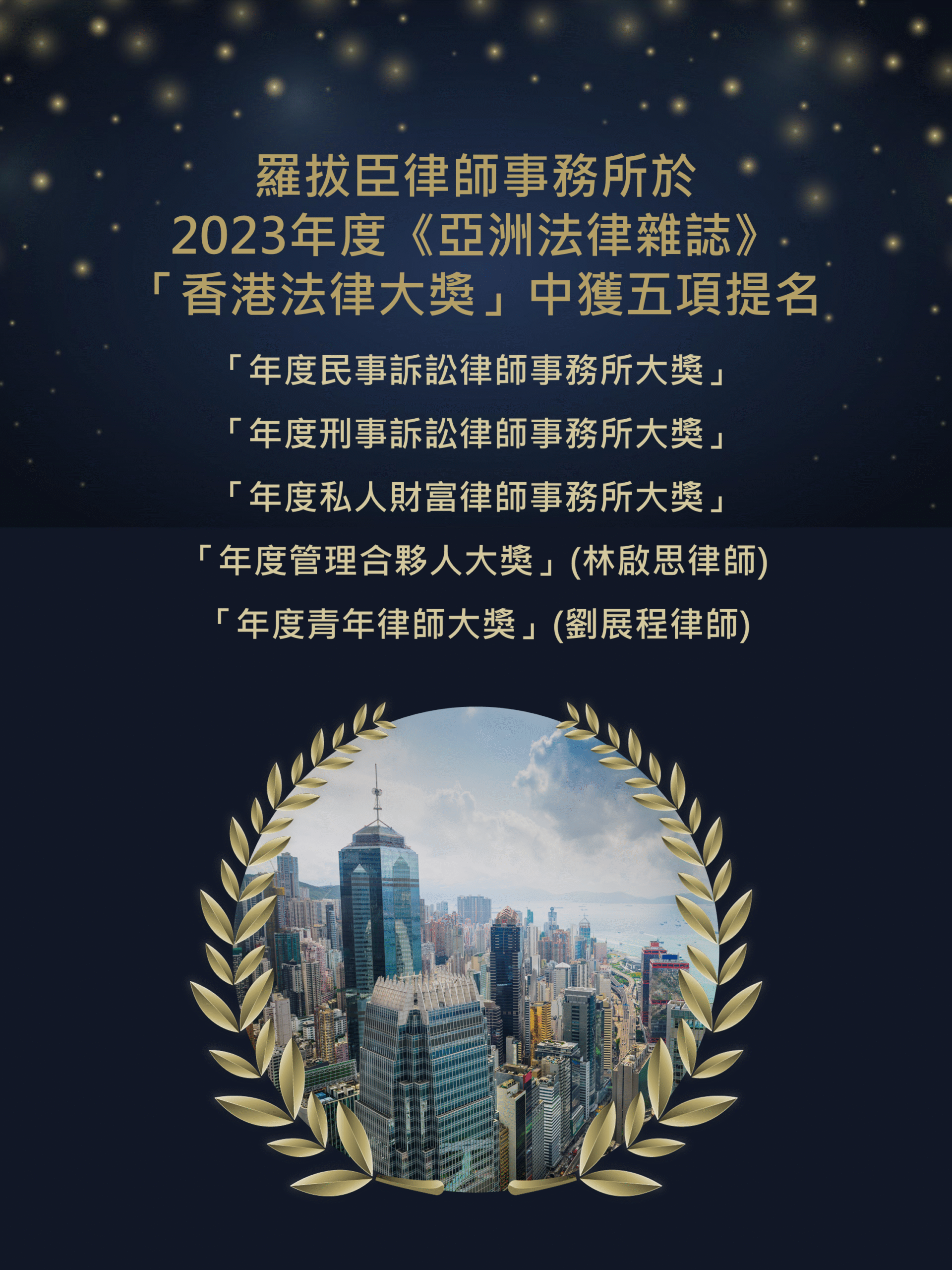 本所於2023年度《亞洲法律雜誌》「香港法律大獎」中獲五項提名